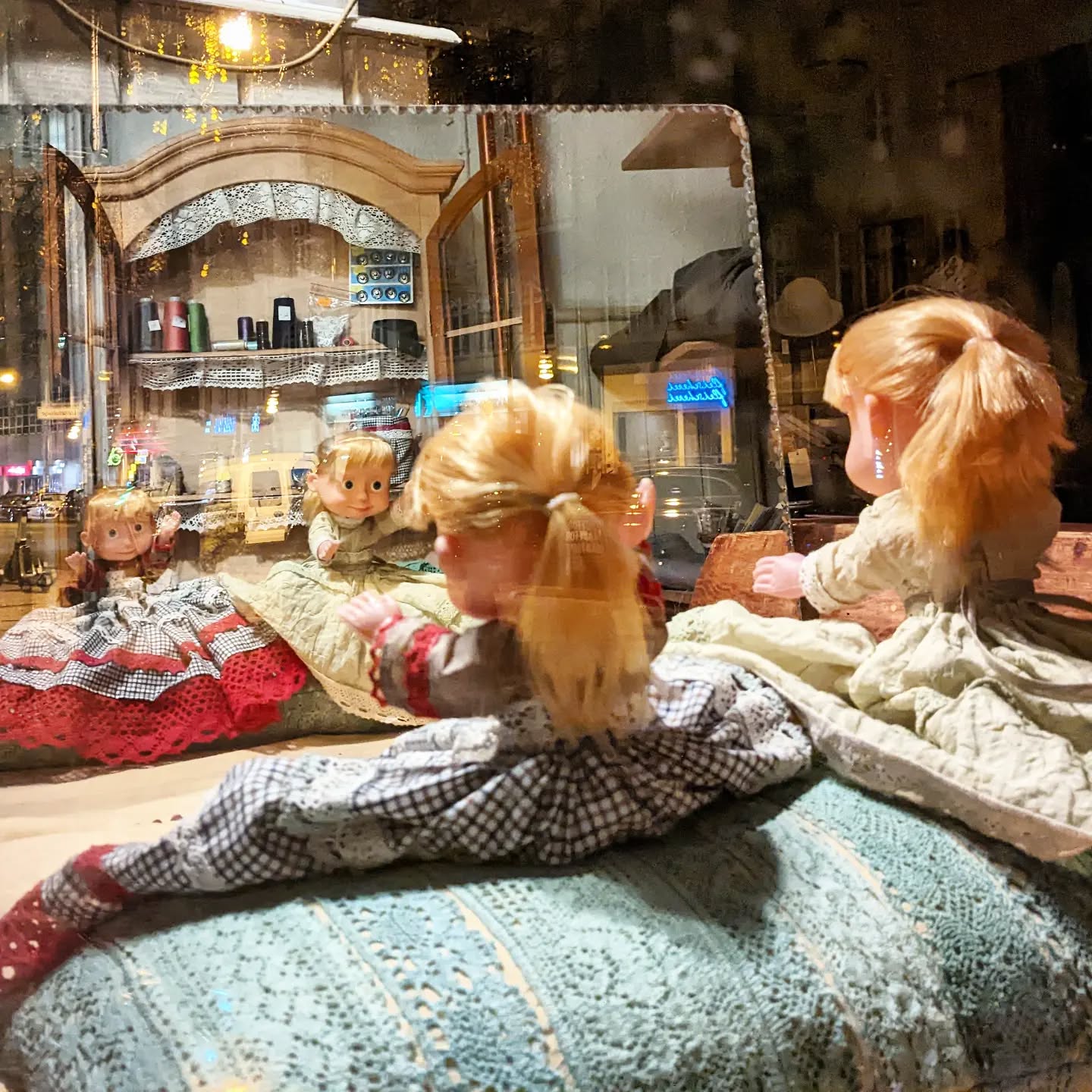 These two girls were chilling in a store window in #berlin bring as creepy as they could be. Very reminiscent of a #theshining scene. Looking at themselves in a mirror as if they were watching TV. #germany #creepy &#dolls