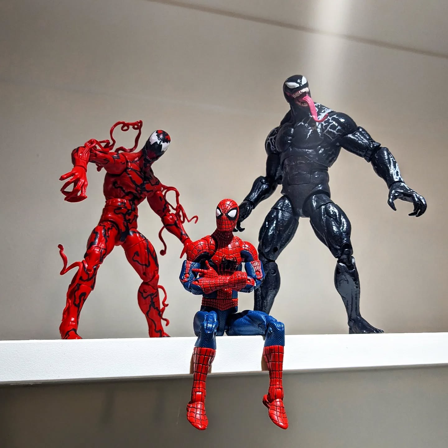 The only non transformers that I got back home. They'll oversee the #livingroom. #spiderman #spiderverse #actionfigures #venon #carnage #marvel #decoration