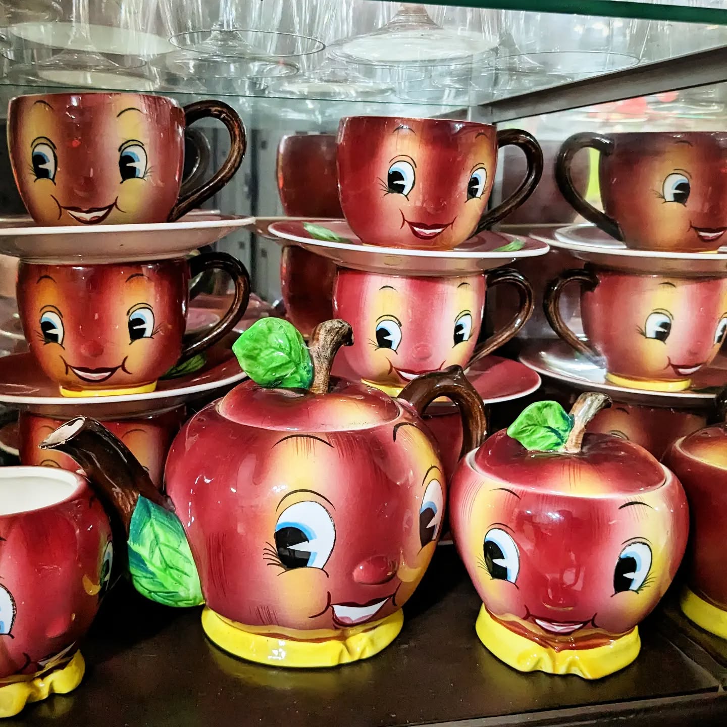 My mom had had these cups for as long as I've been alive and I've never drank anything on them or seen them served. #pot #china #cupboards #apple